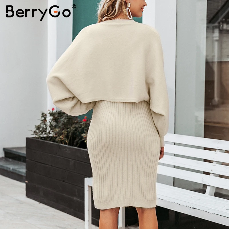 Best Product BerryGo Elegant 2 pieces women knitted dress Solid bodycon sweater dress Autumn winter ladies pullo