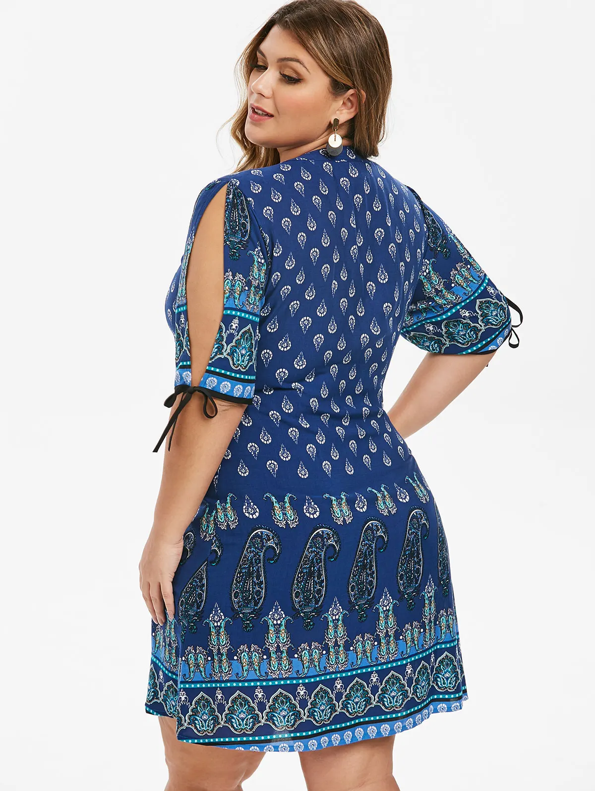 Best Product Rosegal Split Sleeve Ethnic Printed Plus Size Dress Split Half Sleeves A-Line Paisley Print V-neck